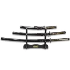 Shikoto Longquan Master Three-Sword Display Stand – Premium Wooden Construction, Sleek Black Finish, Table-Top Design