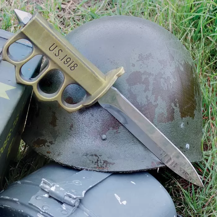 This 1918 WWI replica trench knife is an exact copy of the trusty blade issued to troops during the First World War. Since trench warfare consisted of such gruesome, close-quarter battles, the trench knife allowed soldiers to not only stab but also bludgeon enemies with the knuckle guard handle. The 6 3/8″ AUS-6 stainless steel blade has a double-edge. The heavy duty handle also has a skull crusher. The trench knife is 11″ in overall length.