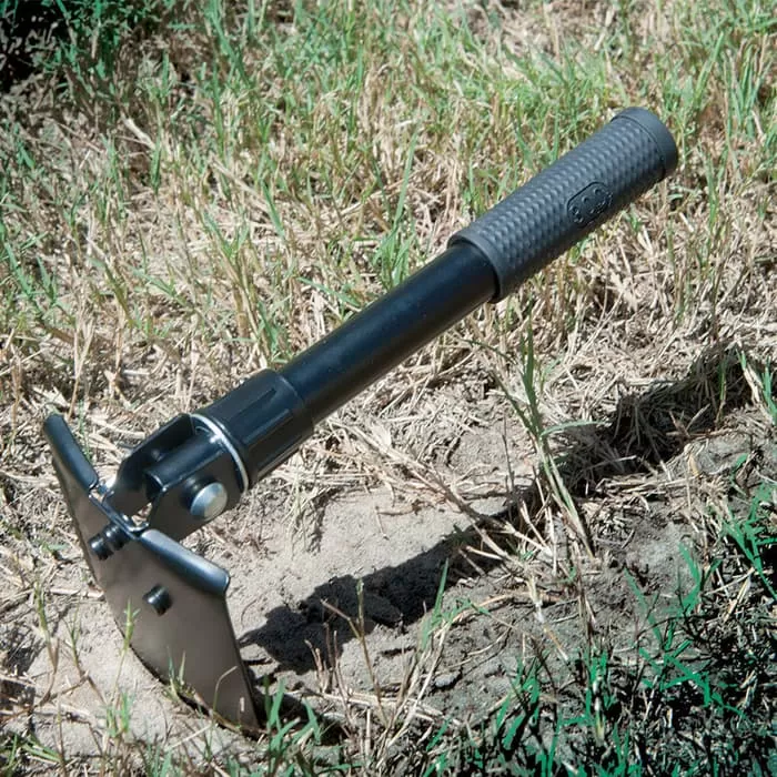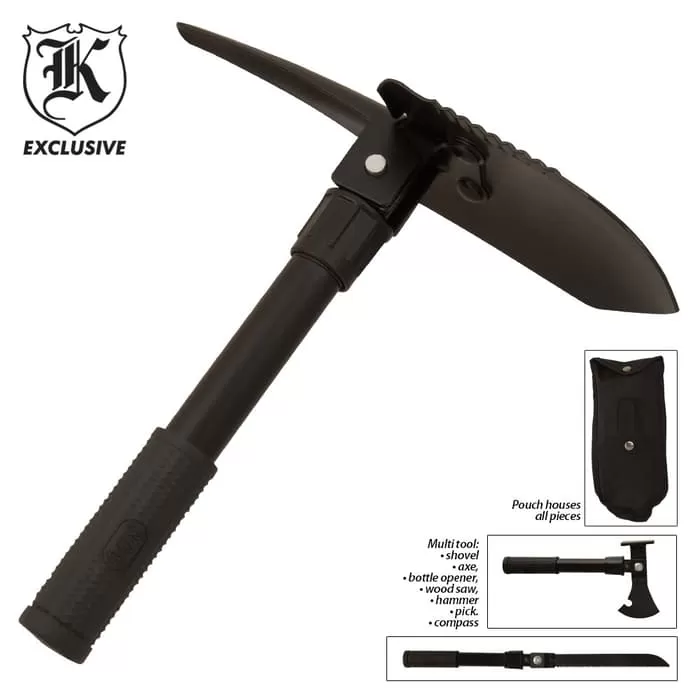 This 5-in-1 Folding Multi-Purpose Tool is constructed of black-coated stainless steel with a no-slip rubber handle grip. This 5-in-1 tool can be used as a shovel, axe, bottle opener, wood saw, hammer and pick so you can do any job with just one tool. 13 1/2″ ov.