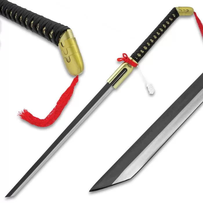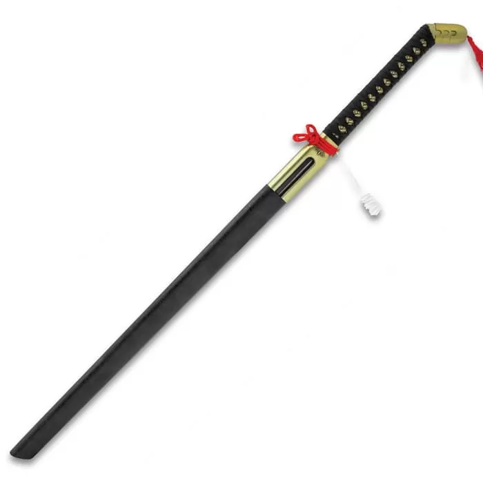 This Anime Fantasy Sword Cane was inspired by the anime show that you just canβt get enough of and the weapon you want to get your hands on! The sword cane is uniquely crafted in a design that you just might wanna pair with your favorite hat and clogs. It has a 28 1/2β, display-edged blade with a two-toned black and silver finish, extending from an extended gold metal blade collar. The wooden handle is wrapped in white, faux rayskin and black cord and it features a particularly unique gold metal cane handle pommel with a red tassel. The 41 1/2β overall fantasy sword cane fits seamlessly into a matte black, wooden scabbard-style sword cane shaft.