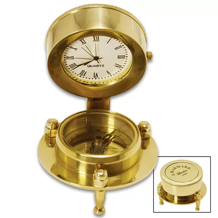 Antique Replica Desk Compass And Clock With Stand – Solid Brass Construction, High-Polish Finish – Dimensions 1 9/10βx 2 3/10β