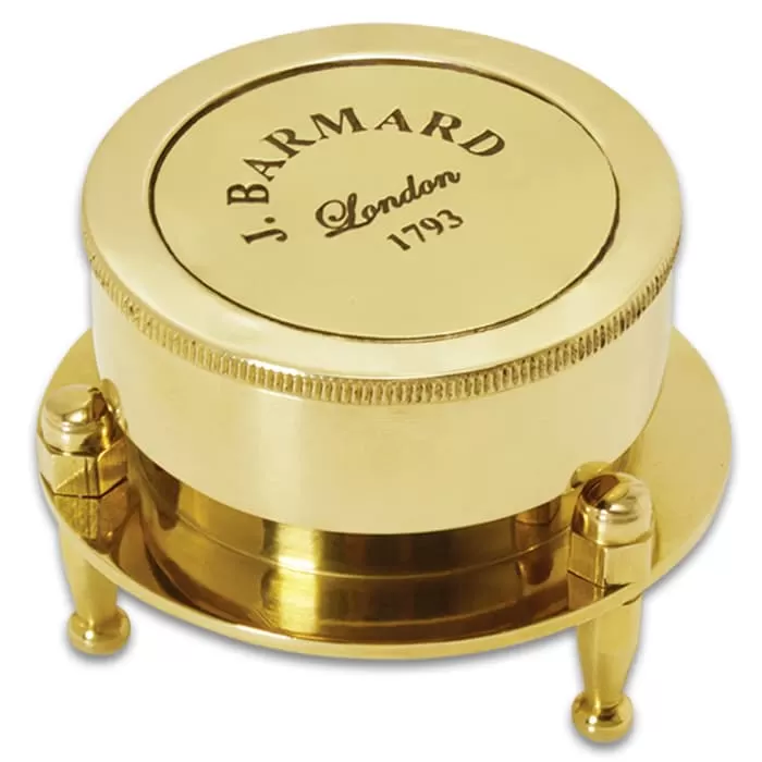 A high-quality display piece, this Antique Replica Desk Compass And Clock makes a great addition to a nautical-themed room in your home or as decor for your boat. The clock has a solid brass construction with a quartz movement timepiece that has Roman numerals and a second hand. The solid brass magnetic compass, which is covered by the clock lid, has a sturdy glass top and metal hands. The entire folding piece, which sits on a brass stand, is 1 9/10βx 2 3/10β and the lid features a reproduction factory stamp. Fine quality and original design make our home decor collection stand above all others!