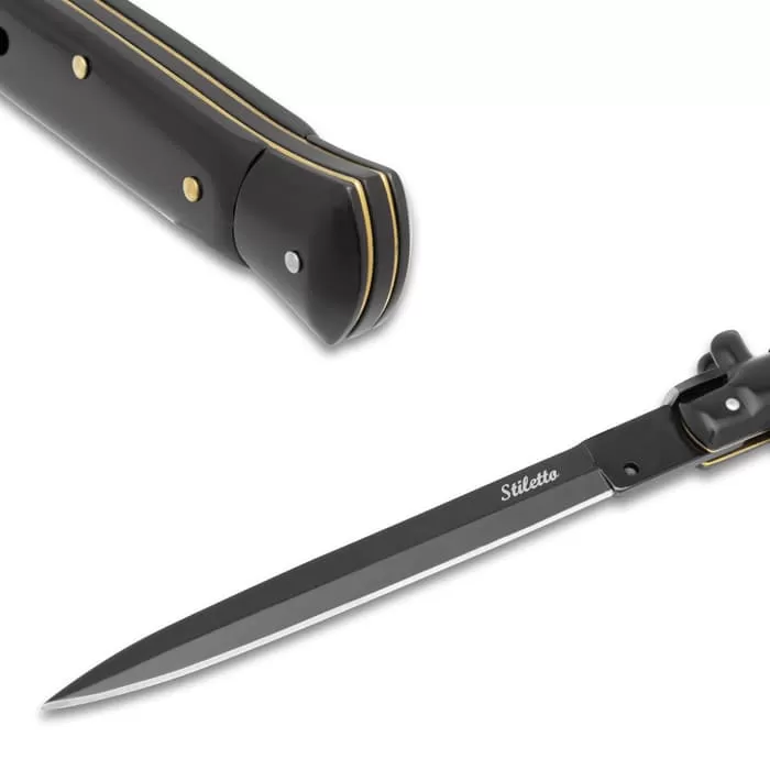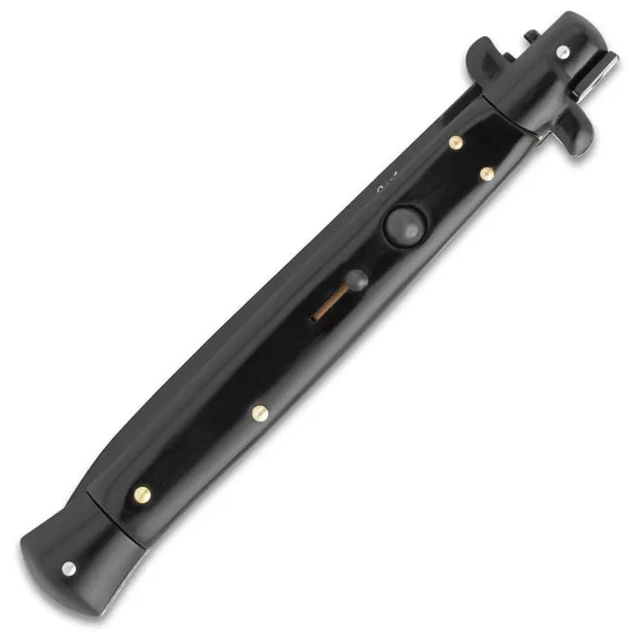 Automatic Italian Black Stiletto Knife With Pouch – Stainless Steel Blade, ABS Handle, Brass Pins – Length 13″