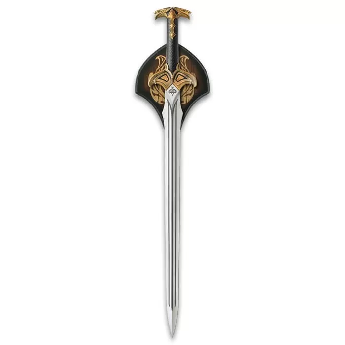 Bard The Bowman’s Sword Replica – The Hobbit, Stainless Steel Blade, Embossed Leather Grip, Wooden Display Plaque – Length 38 3/8″