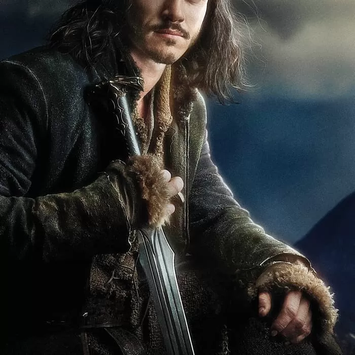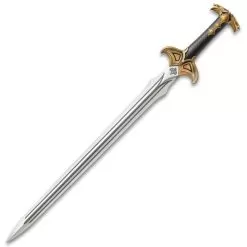 Bard the Bowman was the heir of Girion, the last Lord of Dale, and one of the most proficient archers of men. He wielded Girion’s ancient sword and was keeper of the last Black Arrow of Dale, which he used to slay the great dragon Smaug during the attack on Lake-town. Bard then fought alongside the elves and dwarves against the armies of Azog in the Battle of the Five Armies. He rallied his forces to lead the main defense against the orcs and trolls in the ruins of ancient Dale, bravely wielding his sword in victory over the enemy. The Sword of Bard the Bowman features a hilt bearing design motifs of ancient Dale, with a pommel in the shape of twin bird heads and a leather wrapped grip embossed with an overlapping scaled feather pattern. The blade is adorned with engraved grooves and a rune etching.