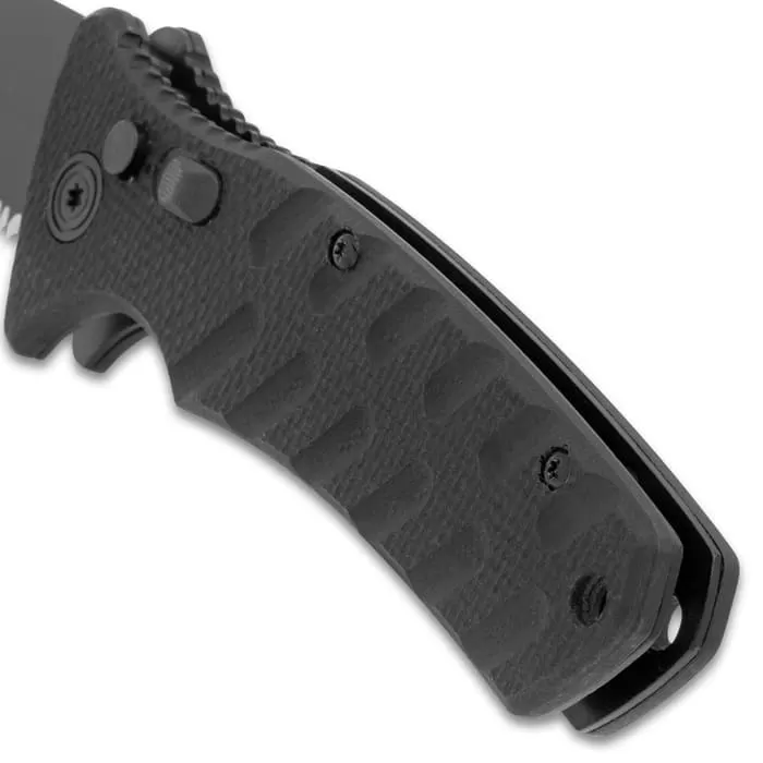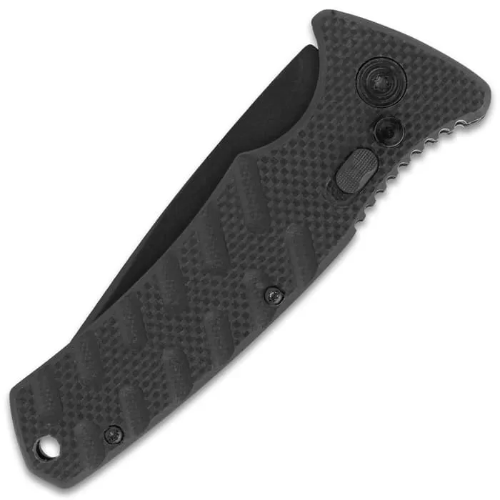 Black Serrated Automatic Knife – Stainless Steel Blade, G10 Handle, Safety Lock, Pocket Clip – Length 8″