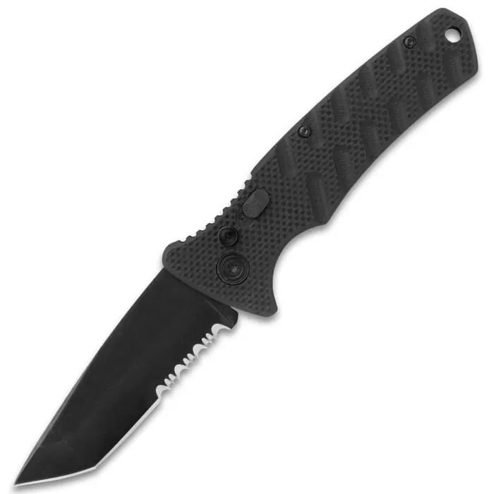 Add the Black Serrated Automatic Knife to your tactical gear and be confident that you’re ready for any cutting task that comes up! The tanto blade has partial serrations and can be deployed with just a push of the button on the handle. Deep grooves and heavy texturing assures that the handle is secure and slip-free in your hand. The automatic knife features a safety lock to prevent accidental deployment.