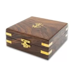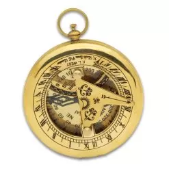 Our Brass Sundial Compass is an attractive piece, in its premium wooden box, to add to your office or home decor. The fully-functional sundial is crafted of polished brass with a glass face, and it is 3″ in diameter. A push fob opens the lid of the compass, which has a red-tipped pointer and easy-to-read degrees and directional points. The sundial folds up from the top of the lid and roman numerals designate the clock times. The compass also has a ring at the top for attaching to a chain. The box has a rope and anchor brass medallion on the lid and each of the corners of the box has a brass accent. The box is secured with a brass latch and the inside of it is lined in velvet.