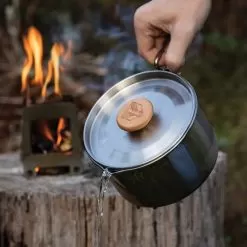 Having a way to boil water when your out in the wild, whether camping or surviving, is essential. Boiling water is the best way to make it potable and is also needed to reconstitute ready-to-eat meals or to make coffee. The compact Bushmaster Ultimate Survival Camp Kettle Pot is one of the most efficient designs on the market. The kettle pot only weighs in at 12.8 ozs. It has a stainless steel construction with a removable lid and a pouring spout so that it can be used as a kettle or pot. The lid has a wooden knob handle. On the side of the pot is an adjustable steel handle, uniquely designed to be used when pouring and to also secure the lid when storing. The kettle pot comes with a mesh bag for storage and carry.