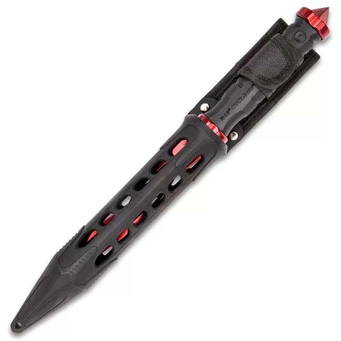 You have never seen anything that compares to United Cutleryβs new M48 Cardinal Sin Red Cyclone Fixed Blade Knife! The red, 8β cast 2Cr13 stainless steel blade has been crafted into a spiraling masterpiece of design, using temperatures up to 1,030 degrees, which gives it a 48HC. The three spiraling cutting edges come down to an incredibly sharp piercing point. As with all M48 knives, the glass-fiber-reinforced nylon handle gives you a strong and secure grip. The Cyclone also features a solid stainless steel hand guard and skull crusher pommel. The blade slides into a custom Vortec belt sheath that fits like a glove and is virtually indestructible. The fixed blade is 13 1/2β in overall length.