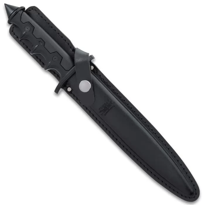 Combat Commander expertly takes tried and true historical weapon designs and updates them for modern warfare. The V42 Stiletto Dagger is a sleek and modern, battle-ready version of the iconic fixed blade. It has an 8 1/8β, 1065 carbon steel dagger blade with a hard, black coating and it goes down to a penetrating point. The handle is of cast aluminum with a textured, black powder coating and no-slip TPR grip inserts and it features a skull-crusher pommel. The 13 3/8β overall dagger can be stored and carried in a premium leather belt sheath with a snap strap closure.