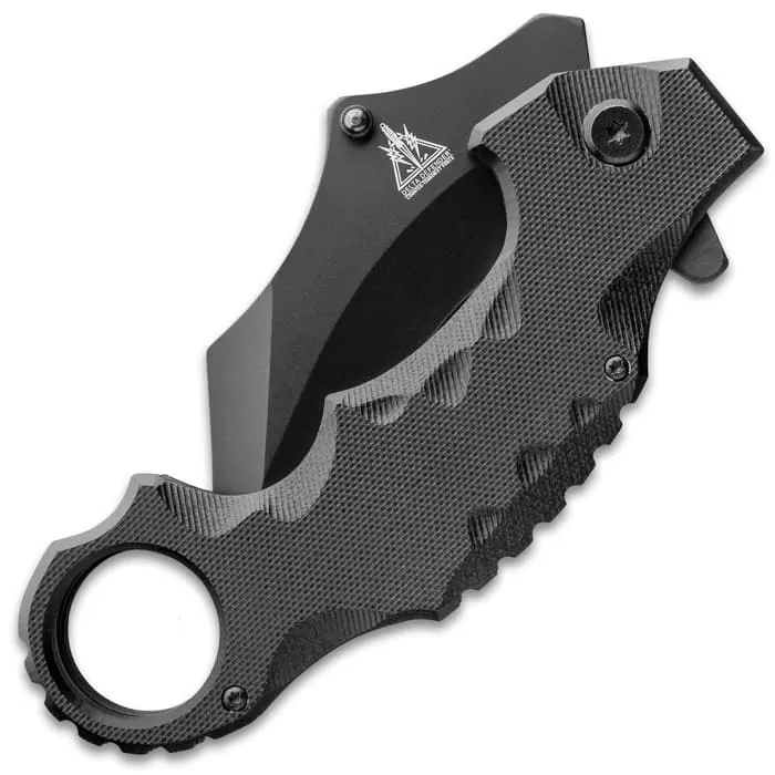 Designed and constructed for the modern battlefield, the Delta Defender Assisted Opening Black Karambit Knife takes a traditional design pumps it up with steroids and folds it so that it will still fit in a pocket. The knife has a 3β razor-sharp karambit blade with a black, non-reflective finish and double thumbstuds for quick deployment, activating the assisted opening mechanism. The textured black G10 handle scales are thick and beefy and have an ergonomic grip for a secure, no-slip hold when using the knife. The folding karambit is 5 1/4β when closed and has the traditional thumb ring and a sturdy pocket clip for ease of carry.