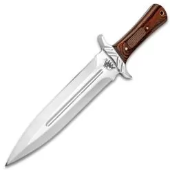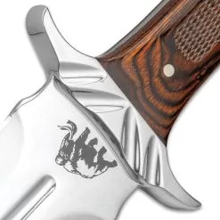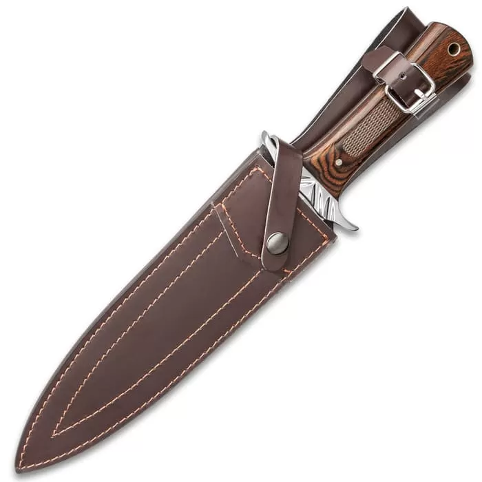 When facing the wilds of North America, back when trading posts were established by the Hudson Bay Company, a trapper needed a knife that would be a weapon and a tool. The Fur Trader Toothpick Knife would have been the knife they preferred. The full-tang, 9 1/4β double-edged stainless steel blade is razor-sharp and features a mirror-polished finish and blood groove. The handle scales are made of dark brown wood and are secured with brass pins and the handguard is stainless steel. The 14 3/4β bowie knife slides securely into a premium leather belt sheath with a buckle strap and a snap closure.