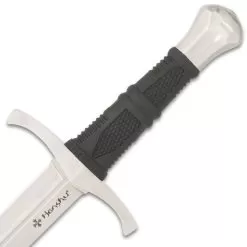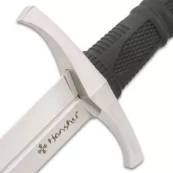 The Honshu Crusader Quillon Dagger was designed specifically to accompany the Honshu Broadsword as a parrying dagger. This fixed blade knife has a keenly sharp, 11 7/8β 1060 carbon steel blade with a satin finish and a blood groove. The textured and ridged, injection-molded TPR handle gives you a secure, slip-free grip even when the conditions are wet. The grip is bookended by a cast 2Cr13 stainless steel pommel and hand guard, both with a satin finish. The 18 5/8β overall dagger can be carried and stored in a genuine black leather belt sheath with snap closure strap.
