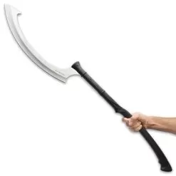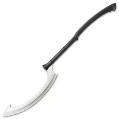 The Honshu Khopesh is a reimagining of the Egyptian sickle-shaped swords that have been found in the burial chambers of Pharaohs. The Egyptian sword has a razor-sharp, 19 1/2β curved, 7Cr13 stainless steel sickle-style blade with a satin finish. The curved handle is crafted of impact-resistant, injection molded nylon and it has a heavily EDM textured grip. The 45 1/8β overall khopesh sword comes with a premium leather blade cover with a double-snap closure.