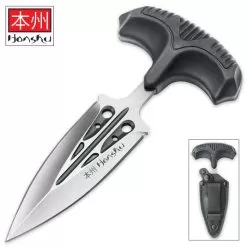 Ideal for covert personal protection, the Honshu Large Covert Defense Push Dagger is that extra measure of peace of mind that youβve been looking for! The discreet self-defense dagger has a sharp 3 3/8β 7Cr13 stainless steel, satin finished blade with a deep pressed groove and through holes. The push handle is textured injection molded TPR rubber, which gives you the best possible grip. The blade slides into a genuine leather sheath that has a quick release snap and features a nickel-plated steel boot clip. Let the Honshu Large Covert Defense Push Dagger back you up!