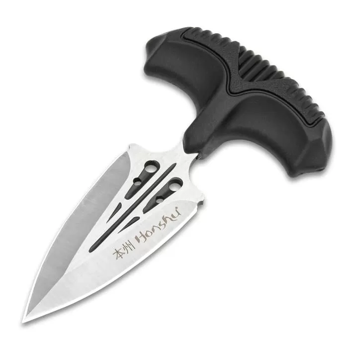 Ideal for covert personal protection, the Honshu Small Covert Defense Push Dagger is that extra measure of peace of mind that youβve been looking for! The discreet self-defense dagger has a sharp 2 5/8β 7Cr13 stainless steel, satin finished blade with a deep pressed groove and through holes. The push handle is textured injection molded TPR rubber, which gives you the best possible grip. The blade slides into a genuine leather sheath that has a quick release snap and features a nickel-plated steel boot clip. Let the Honshu Small Covert Defense Push Dagger back you up!
