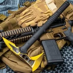Worthy of a superhero, the Iron Man Collectors Set puts a powerful collection of weapons in your hand. All pulled from M48βs line of incredible tactical weapons, youβre getting two tomahawk axes, a dagger and a boot knife. Both of the tomahawk axes have razor-sharp, 3 7/8β upswept blades with needle-sharp, piercing spikes on the back end. The handles are nylon-reinforced fiberglass with no-slip, ridged grips. The Cardinal Sin Tomahawk Axe has a blood-red, 8β cast stainless steel head with weight-reducing thru-holes and the Gold Tomahawk Axe has the same but in a liquid gold color. Each is 15β in overall length and comes with a sheath to protect the axe head. Both the Cyclone Boot Knife and Cyclone Dagger have cast stainless steel blades crafted with three spiraling edges that come down to an incredibly sharp piercing point. As with all M48 knives, they have a glass-fiber-reinforced nylon handle with a solid, stainless steel skull-crusher pommel. The Solar Flare Dagger has an 8β liquid-gold colored blade and the Cardinal Sin Boot Knife has a 5 3/4β blood-red colored blade. Each slides into a custom Vortec belt sheath thatβs virtually indestructible.