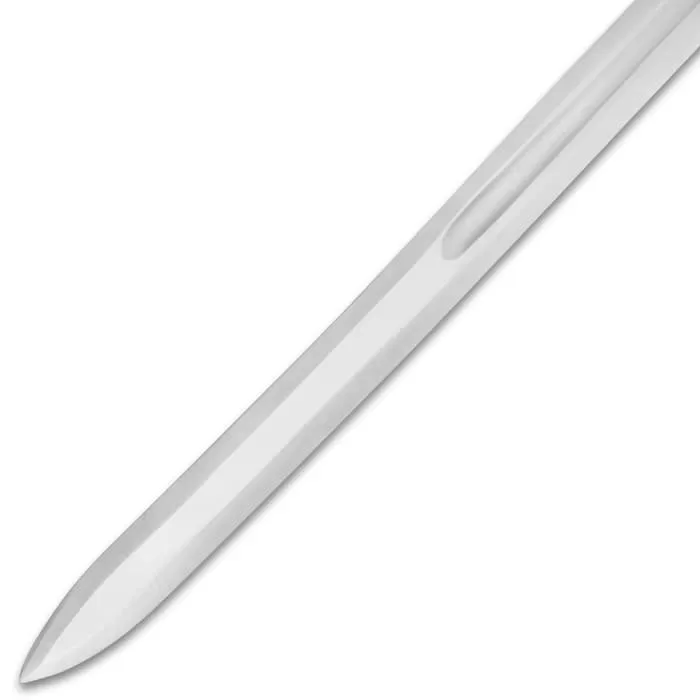 The Legends In Steel Medieval Knight Long Sword makes a great cosplay, theatrical performance or costume party accessory. It pairs perfectly with any Medieval costume for any occasion. The display-edged sword can be carried at your side in its leather scabbard with the attached belt loop. The blade has a polished finish and is crafted of strong, 1095 high carbon steel. A downward angled, crossguard made of heavy-duty stainless steel sits above the blade. The sword has a metal handle with a leather-wrapped grip and a stainless steel pommel.
