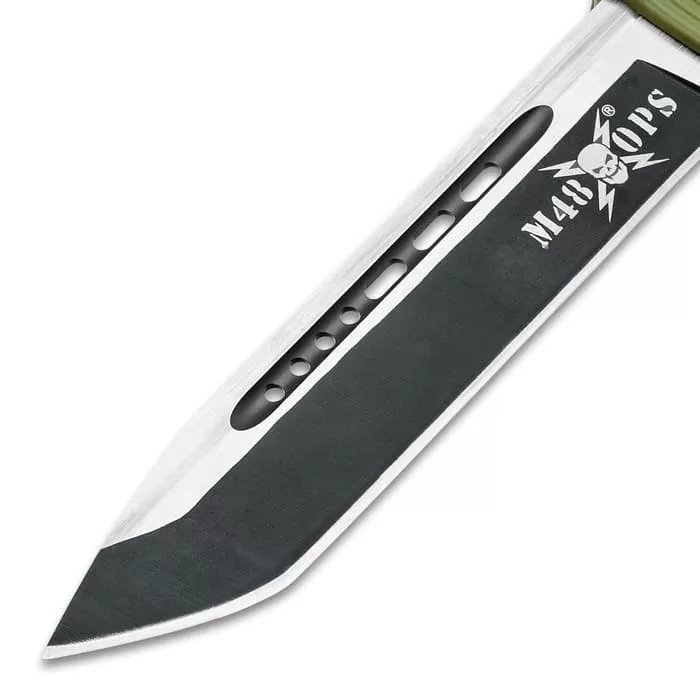 Built to take into battle, the M48 Camo Automatic OTF opens lightning fast when you need it most. It has a stainless steel tanto blade that’s razor-sharp and shoots out-the-front of a tough, TPU handle that’s been custom Cerakoted in the USA by a custom Cerakote applicator. The grippy handle also features a pocket clip and a glassbreaker.