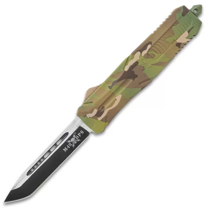 M48 Camo Automatic OTF Knife – Stainless Steel Blade, Cerakote Coated TPU Handle, Slide Trigger, Pocket Clip – Length 9 1/2″