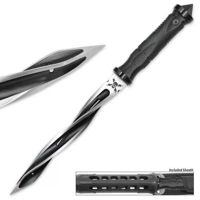 You have never seen anything that compares to United Cutleryโs new M48 Cyclone Fixed Blade Knife! The 8โ cast stainless steel blade has been crafted into a spiraling masterpiece of design, using temperatures up to 1,030 degrees, which gives it a 48HC. The three spiraling cutting edges come down to an incredibly sharp piercing point. As with all M48 knives, the glass-fiber-reinforced nylon handle gives you a strong and secure grip. The Cyclone also features a solid stainless steel hand guard and skull crusher pommel. The blade slides into a custom Vortec belt sheath that fits like a glove and is virtually indestructible. The fixed blade is 13 1/2โ in overall length.