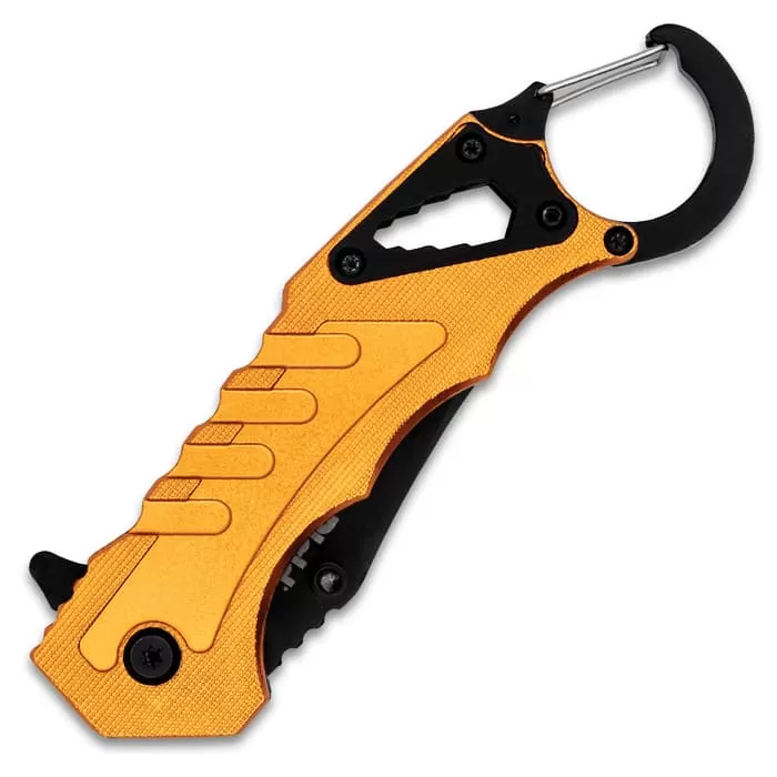 An EDC that you just canβt let pass you by, the Rigid Multi-Function Knife With Carabiner Clip is packed with features. The pocket knife has a black, clip point blade that can be quickly deployed with the flipper, activating the smooth assisted opening mechanism. Three features are integrated into the slip-free, rescue orange aluminum handle including a screwdriver and a carabiner pommel with a bottle opener.