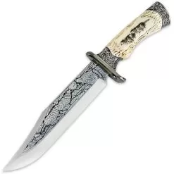 This Custom Running Wolf Bowie knife features intricate blade etchings and a wolf scene on the resin handle. It has a 6 3/4″ stainless steel blade and the bowie is 10 3/4″ overall. It comes in a full-color hardwood display box. This knife is a beautiful piece to add to your collection!