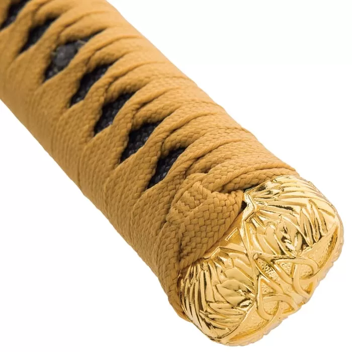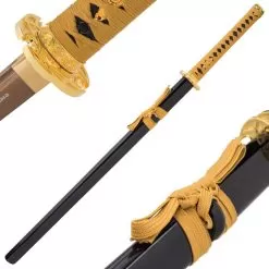 When you own a Shinwa, you have a sword that has been meticulously hand-forged using ancient, time-honored tempering techniques that give it a custom, one-of-a-kind look and feel. The Shinwa Golden Warrior Katana is another fine example of the artistry you can only get with a hand-forged sword. The keenly sharp, 28 1/2β blade is hand-forged of 1045 carbon steel with a gold finish, and it extends from a solid, brass habaki. The handle is wrapped in faux ray skin and gold cord-wrap and the handguard and pommel are metal alloy with a gold finish. The 40β overall katana slides securely into a black lacquered wooden scabbard, which has a gold cord-wrap accent. Shinwa swords have a quality standard like no other and you won’t find a more functional or beautiful katana at this price!
