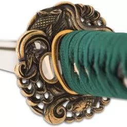Battle ready and display worthy, the Green River Katana is handcrafted by seasoned artisans with the unrivaled quality and meticulous attention detail that Shinwa is renowned for. The sword has a keenly sharp, 27β 1045 carbon steel blade with a dark finish, which extends from an antique gold-toned river-themed tsuba. The hardwood handle is wrapped in genuine black rayskin and wrapped in green cord and the habaki is polished brass. The 41β overall katana slides securely into its green splatter-painted wooden scabbard with a black cord-wrap accent.