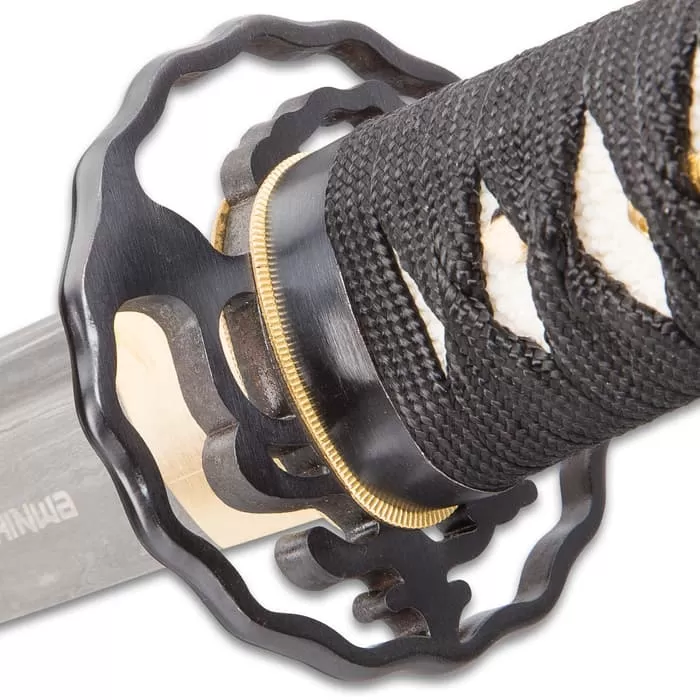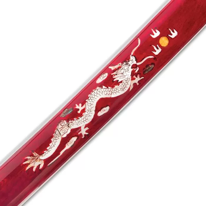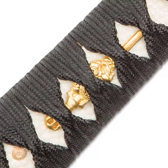The blade’s visually electrifying beauty is matched only by the exquisitely adorned hand-lacquered saya. Paying homage to its namesake, a stately Eastern dragon lithely dances across the saya in a spectacularly detailed mother of pearl inlay. Like a fine opal, the mother of pearl glints and shimmers with shades of azure, emerald, ruby and pearl. The hand painted sun and cloud accents that encircle the central dragon impart the feel of a traditional Japanese watercolor illustration. It’s the kind of otherworldly allure that demands to be shown off – in a collection, mounted on the wall, on a mantle or any other space. And when the ever-fierce Imperial Dragon Katana makes a demand, one best take heed!