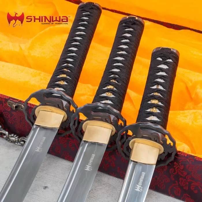 This highly detailed Samurai sword set is the most exquisite set ever produced by Shinwa sword masters. Each of the 1060 carbon steel blades is hand-forged by skilled artisans and then wrapped in real ray skin and a traditional cord-wrapped handle. Intricately detailed tsubas are accented by a gold-plated menuki and habaki. The lacquered wooden scabbards are inlaid with a beautiful dragon inlay created with real, natural pearl. This three-piece set includes a custom Shinwa wooden sword stand.