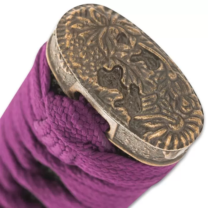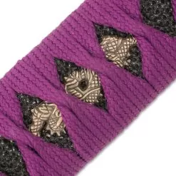 Battle ready and display worthy, the Purple Serpent Katana is handcrafted by seasoned artisans with the unrivaled quality and meticulous attention detail that Shinwa is renowned for. The sword has a keenly sharp, 27β 1045 carbon steel blade with a dark purple finish, which extends from an antique gold-toned serpent tsuba. The hardwood handle is wrapped in genuine black rayskin and wrapped in purple cord and the habaki is polished brass. The 41β overall katana slides securely into its purple, spatter-painted wooden scabbard with purple and yellow cord-wrap.
