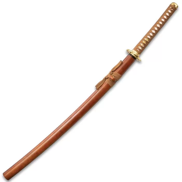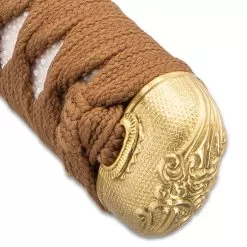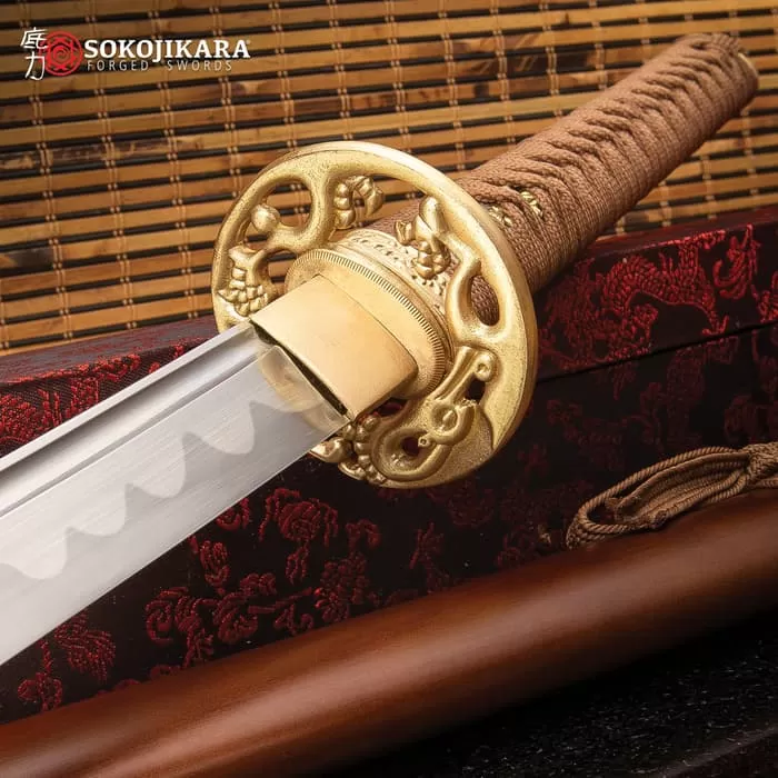 Using the age-old process of clay tempering, to forge swords that have the perfect balance of strength and flexibility, has been completely perfected by our swordsmiths at Sokojikara. The Dragon Wood Katana has a warm, earthy feel with its brown and brass tones and beautiful reddish-brown wooden scabbard – an elegant addition to our Sokojikara family of swords. The katana has a 29β, T10 high carbon steel blade that was expertly hand-forged, assuring you that itβs incredibly sharp and perfectly balanced. The wooden handle has been traditionally wrapped in genuine rayskin and brown cord with brass dragon menuki to complement the decorative brass pommel. The highly polished brass tsuba is an open and airy, circular dragonish design and the blade extends from a brass habaki. The Dragon Wood is heirloom-quality and built to be treasured by generations of your descendants – your legacy preserved in hand forged steel.