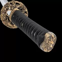 The hand-forged blade’s edge is Damascus, and its spine is hammered Damascus, giving it a rough-forged look. The handle is expertly wrapped in rayskin and black cord in the traditional Japanese style and the antique looking tsuba has an intricate dragon design. The included black, lacquered scabbard has a hand-painted, blue crackle design on its upper third and a hand-painted golden dragon that spans the rest of its length.