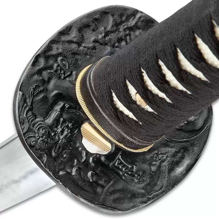 Impeccably balanced, the Scorn’s weight is shrewdly distributed for improved control and agility, quicker response, as well as maximum power from every swing. The delicately textured genuine ray skin same and soft braided ito that cloak the tsuka afford a comfortable, no-slip grip, further enhancing the sword’s superb feel. Expertly cast from iron and embellished with delicate reliefs, the tsuba guards the hand, while conferring an alluringly dark vibe. Nestled between ito and ray skin same, the classic brass menuki affords a vibrant contrast to the Scorn’s sea of black.