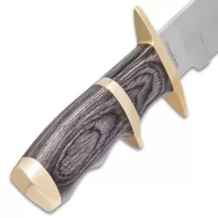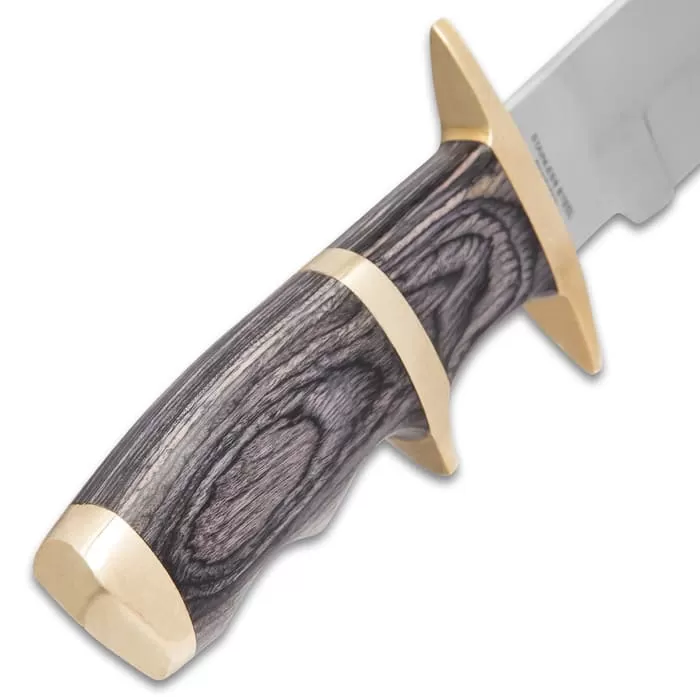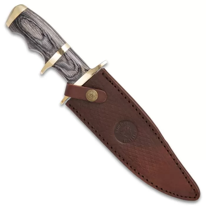 Skinning a buffalo requires a big, sharp blade, and that’s just what the Timber Rattler Buffalo Joe Fixed Blade Knife is at 12 1/8″ overall. A black pakkawood handle is accented by a brass plated pommel, guard and trigger handle. A 7 1/4″ stainless steel blade is honed to a razor sharp edge to make quick work of any task. Includes brown leather sheath.
