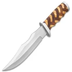 An absolutely beautifully crafted fixed blade, the Timber Rattler Handcrafted Heirloom Bowie Knife was painstakingly produced by hand to give you both a functional and collectible knife. The handle is handcrafted of genuine walnut and olive wood, in a basket-weave pattern of alternating light and dark brown tones, giving it a supremely unique look that cannot be matched. It has a keenly sharp, 7β stainless steel blade, which extends from a hefty, stainless steel handguard to match the pommel. The handsome 12β overall fixed blade knife slides securely into a premium leather belt sheath with embossed decorations.