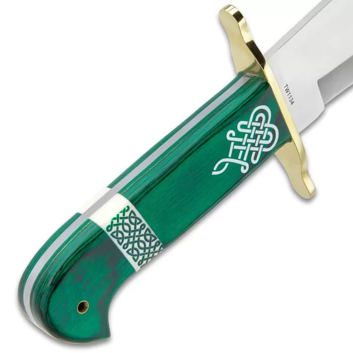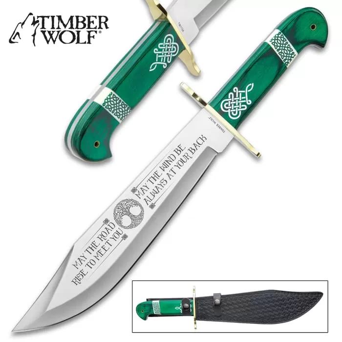 The Timber Wolf Celtic Heritage Bowie Knife belongs in the collection of any proud Irishman with its heirloom quality craftsmanship that memorializes Irish wisdom and Celtic heritage. It has a 10 1/2β, razor-sharp stainless steel blade with the Tree of Life and βMay The Road Rise To Meet You; May The Wind Be Always At Your Backβ laser-etched across its length. The handle scales are a Kelly green pakkawood with white, printed knotwork and a bone band etched with Celtic knotwork. The bowie knife has a solid, brass handguard and a brass lanyard hole in the handle of the pommel. A premium leather belt sheath with decorative embossing and snap closures protects the 16β overall fixed blade knife.
