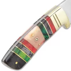 The Timber Wolf Emerald Isle Knife is an ornate, workhorse fixed blade that would have been worn at the side of a Gaelic chieftain for everyday cutting tasks. The hefty knife has a keenly sharp, 4 3/4β stainless steel, full-tang blade with a full bellied profile that is 1/4β thick, making it perfect for cutting and chopping. The rich handle scales are multi-colored wood and bone panels, accented with brass spacers and a rosette. The scales are secured to the tang with brass pins, which match the polished brass bolster. The 9β overall fixed blade knife slides securely into a premium leather belt sheath for ease of carry and protective storage.
