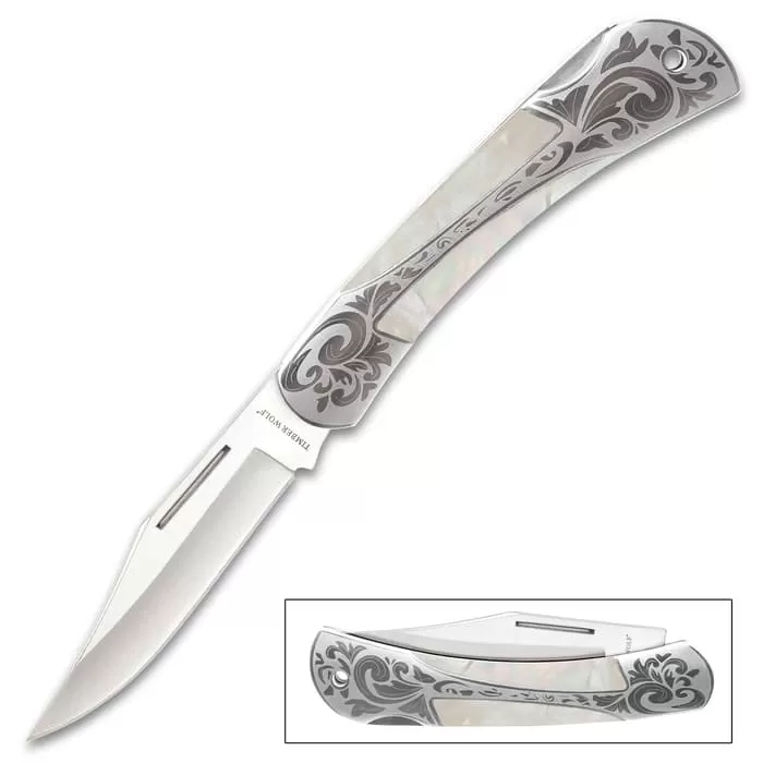 A smooth, elegant design combined with rugged functionality; this Gentleman’s Genuine Pearl Pocket Knife from Timber Wolf makes the perfect everyday carry for that someone special in your life. The knife is equipped with a polished 3 1/4” razor-sharp, stainless steel clip point blade with a nail nick for ease of opening. The custom handle features genuine pearl inlays and the nickel silver bolsters with intricate scroll designs complete the design. The elegant lock back pocket knife is 7 1/2″ in overall length and 4 1/4”, when closed.