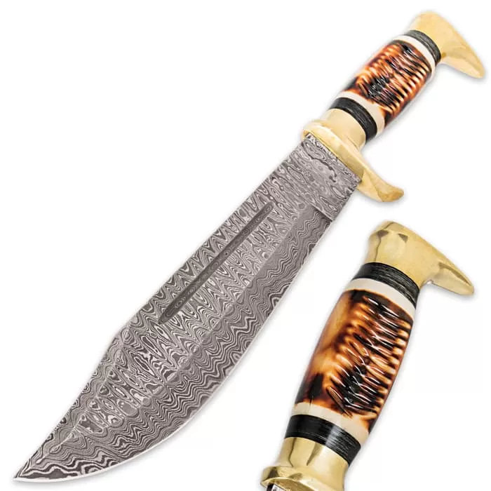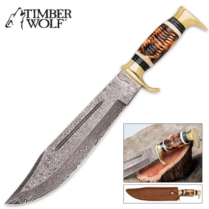 Another masterpiece by Timber Wolf, the Golden Stag Bowie is a mixture of aesthetic beauty and sheer power. The Damascus steel blade with its deep blood grooves is massive at 10 1/2″ and is like a razorโs edge. The striking bone handle is in hues of brown that remind you why you like deer hunting. The brass pommel and guard compliment this Bowie knife. A brown sheath completes the package.