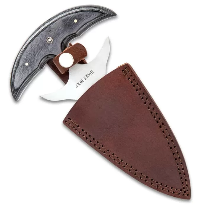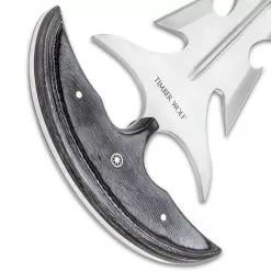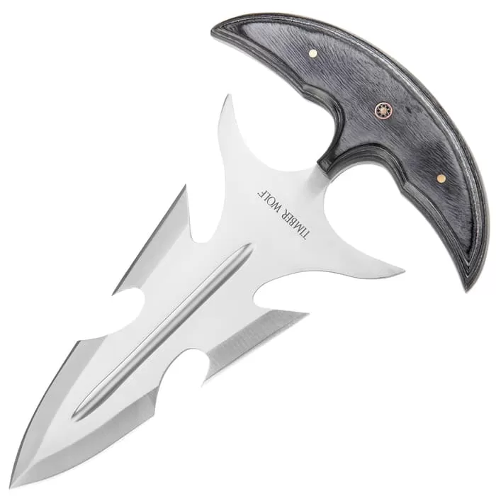 The Timber Wolf Great White Push Dagger will cut and slice its way through a threat like that fierce predator of the ocean chomps its way through its prey. The full-tang, 6 3/4β stainless steel blade is aggressively jagged with razor-sharp edges going down to a sharp point. The ergonomically grooved, black wooden handle scales feature a rosette accent and are secured to the tang by brass pins. The wicked 8 3/4β overall push dagger can be carried and stored in a premium leather belt sheath with snap closure.