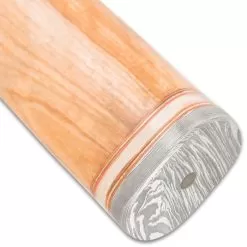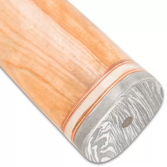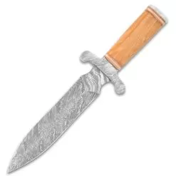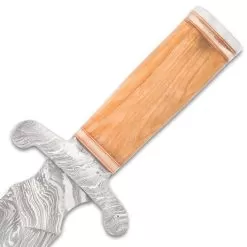 The beefy Timber Wolf Greco Knife might have been used by one of the formidable Spartan warriors in battle. The knife has a keenly sharp, 9 1/4β fire-patterned steel blade extending from an upwardly curved stainless steel handguard. The rounded handle is crafted of light brown oil wood, accented with stainless steel bands and it has a Damascus pommel. The attractive 14 1/2β overall fixed blade knife slides into a premium leather belt sheath for ease of carry and storage.