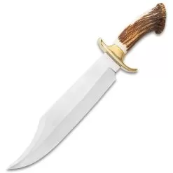 The Timber Wolf King Stag Antler Crown Knife is a beautiful, nature-inspired piece that it looks like it came right from the earth itself with the sole purpose of hunting wooly mammoths. The massive stainless steel blade is a whopping 3β wide, 3/8β thick and has a razor-sharp 15β edge with a modified clip point. The genuine bone handle has a stag antler crown pommel and the hefty, curved handguard is of polished, solid brass. The gargantuan 22 1/2β overall fixed blade knife is housed in an embossed, premium genuine leather belt sheath.