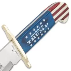 The Timber Wolf Limited Edition Trump Bowie Knife beautifully commemorates the 45th President of the United States. It has a 10 1/2β full-tang 3Cr13 stainless steel blade with a President Trump themed etching and a brass handguard. The handle scales are crafted of blue wood, accented with alternating stripes of white resin and reddish brown wood. Inserted into the center of the handle, in bright white, are the words βDonald Trumpβ flanked by two rows of stars. The blade is housed in a premium leather belt sheath with a snap closure. Timber Wolf continues to bring you top-quality knives with a custom look and feel at unheard-of prices!