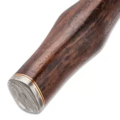 The Timber Wolf Myrmidon Short Sword is the weapon Achillesβ men would have carried into the battle for Troy, if it had existed during that legendary time. It has a keenly sharp, 12 1/4β, double-edged Damascus steel blade, which leads to a curved Damascus steel handguard. The brown wooden handle is accented with red wooden spacers and brass spacers, complementing the Damascus pommel. The 18 1/4β overall short sword slides securely into a premium, brown leather belt sheath with white top-stitching.