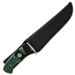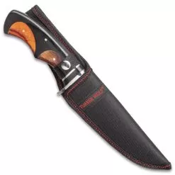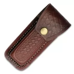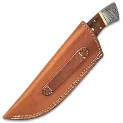 The Timber Wolf Myrmidon Short Sword is the weapon Achillesβ men would have carried into the battle for Troy, if it had existed during that legendary time. It has a keenly sharp, 12 1/4β, double-edged Damascus steel blade, which leads to a curved Damascus steel handguard. The brown wooden handle is accented with red wooden spacers and brass spacers, complementing the Damascus pommel. The 18 1/4β overall short sword slides securely into a premium, brown leather belt sheath with white top-stitching.