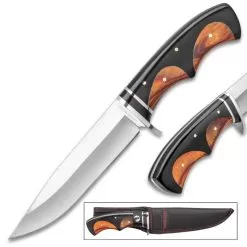 The Peruvian Knife from Timber Wolf is a handsome fixed blade, which features a handle crafted of curved black and brown wood pieces separated by thin, curved lines of inlaid brass. The curves of the handle, as well as being visually pleasing, also serve to provide a comfortable grip. The handle scales are secured to the full-tang with brass pins and the handle has a brass lanyard hole. The 6β razor-sharp, 3Cr13 stainless steel blade has a mirror-polished finish that extends to a stainless steel guard. The handsome 10 3/4β overall fixed blade knife slides securely into a sturdy nylon belt sheath with a snap closure.