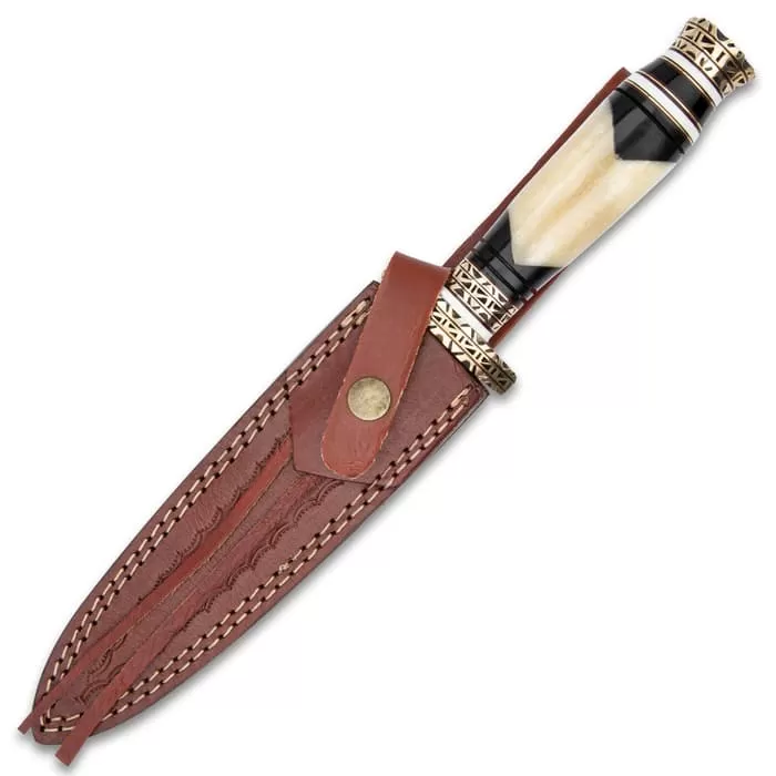 The Timber Wolf Zulu Dagger is an eye-catching collectible knife that was inspired by the Zulu warriors of South Africa. It has a sharp, 7 1/2β Damascus steel dagger blade with a penetrating point, extending from a brass fileworked guard. The handle is crafted of natural and brown bone with brass fileworked accents, and it has a brass fileworked pommel. The 12 3/4β overall dagger can be stored and carried in its premium leather belt sheath, which has a snap strap.